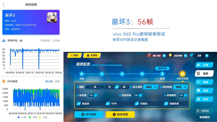 在比较吃硬件性能的《崩坏3》测试中,帧数整体波动要大一些,因此平均帧数只有56帧,不过游戏画面整体同样很流畅,游戏体验仍旧比较好。