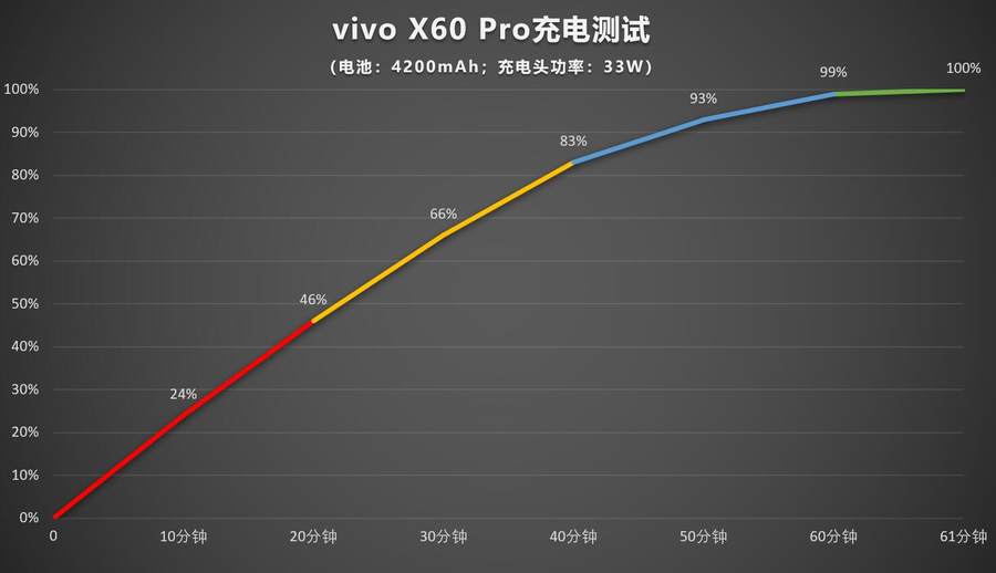 在手机耗尽电量自动关机后开始充电测试,30分钟就能达到66%的电量,达到100%的电量只需61分钟。虽然vivo X60 Pro的快充功率并没有特别激进,但实际充电表现还不错,不用等待太长时间。