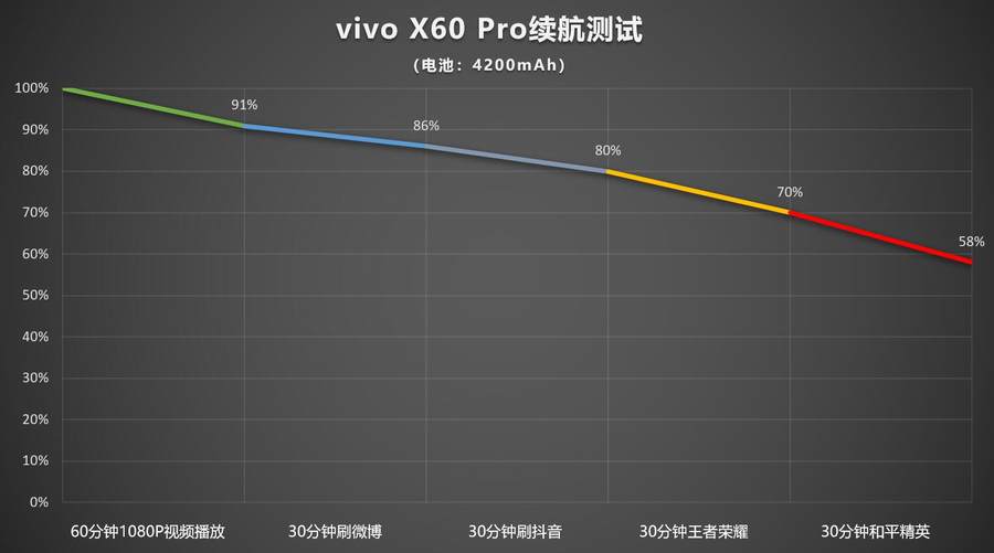 vivo X60 Pro配备了33W FlashCharge闪充,内置4200mAh电池,实际充电续航部分的表现我们都进行了测试。