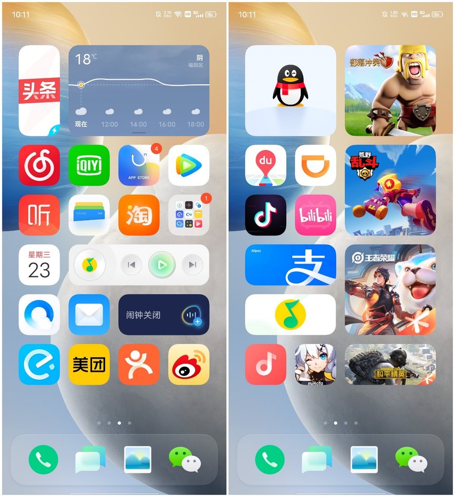 Origin OS采用华容网格设计,界面看上去简洁大气,大图标设计很有视觉冲击感,图标下方文字为隐藏式设计,只要长按桌面才会显示出具体APP名称,减少对视觉的干扰。
