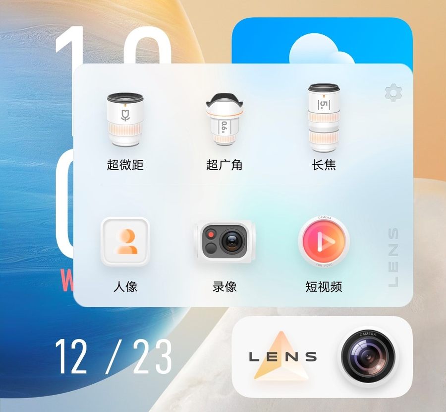 值得一提的是,点击桌面的镜头包图标,会弹出包括各种镜头的界面,这样就能快速打开超广角、长焦、录像等相机功能,省去了需要进入相机界面才能切换的繁琐步骤。