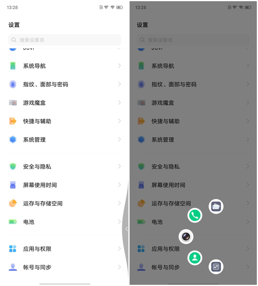 iQOO 7还支持侧滑手势功能,从界面的一侧滑动,然后在屏幕上静止1秒就可以呼出快捷菜单,可以直接进入到拍照、电话等功能当中,更加的方便。