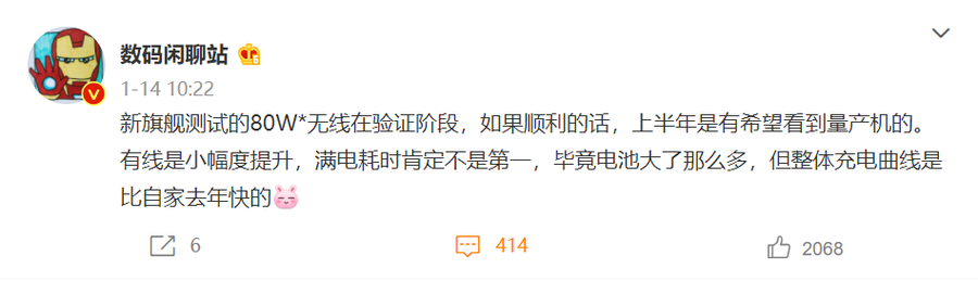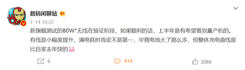 今天,@数码闲聊站爆料,一款新的旗舰手机正在测试80W无线快充,如果顺利,上半年有望看到量产机。