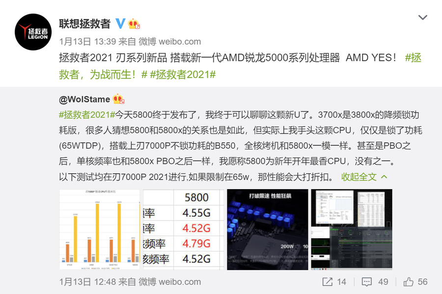 联想中国游戏台式机产品规划经理 @WolStame 结合自己的实测数据表示,R7-5800仅仅只是R7-5800X的锁功耗版,搭载上刃7000不锁功耗的B550主板,全核烤机频率可以跟5800X一样,甚至二者在PBO之后的单核频率也一样。他还称 R7-5800 为新年开年最香 CPU。