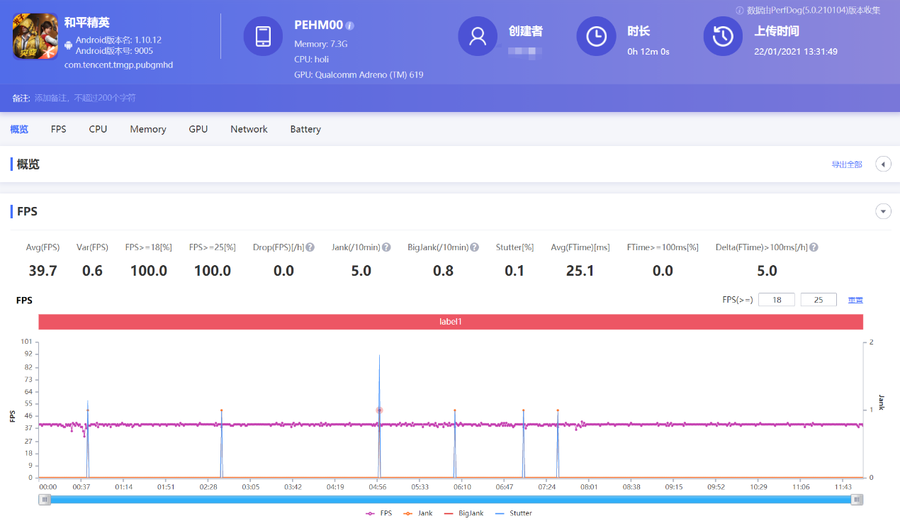 《和平精英》对手机性能的要求更高,在均衡画面品质设置下,可以开启超高帧数,其余特效为全开。根据软件记录的帧数,游戏平均帧数为39.7帧,全程都很稳定流畅。如果不是因为游戏画质设置限制在40帧,应该会有更加流畅的体验。