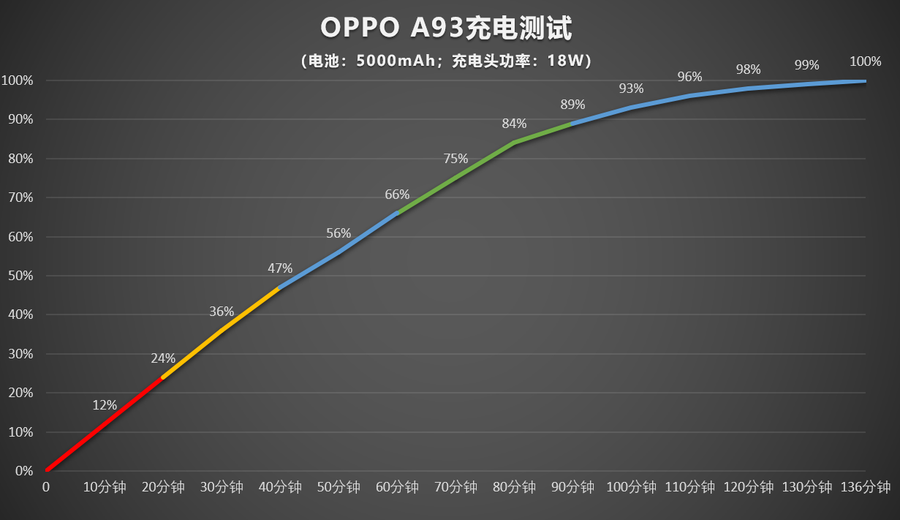 在电量耗尽自动关机后开始充电测试,30分钟可达36%的电量,60分钟后达到66%的电量,充满则需要136分钟。这样的充电速度算不上快,但考虑到采用的是5000mAh大电池,所以也是可以接受的。