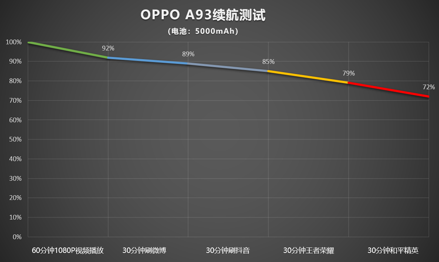 实测的耗电情况为:在线观看一小时1080P视频耗电8%,30分钟微博耗电3%,30分钟抖音耗电4%,30分钟《王者荣耀》耗电6%,30分钟《和平精英》耗电7%,最终剩余电量为72%。在大电池及各项优化的加持下,OPPO A93的续航优势比较明显。