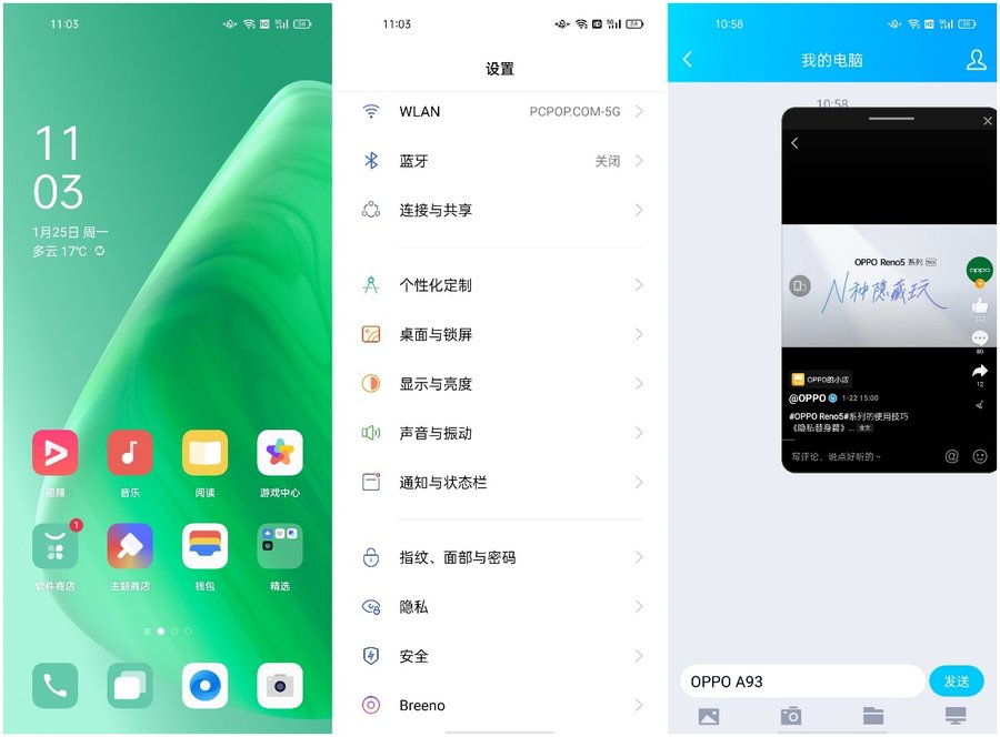 OPPO A93搭载了最新的ColorOS11.1系统,相比ColorOS 7,有着全面的提升。ColorOS11.1的界面简约清新,优秀的系统动画效果搭配90Hz的屏幕,视觉体验丝滑自然。因为有着大内存和相对不错的性能加持,多开应用时也能保证系统流畅度,切换自如。