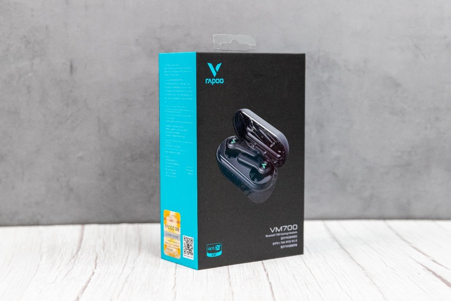 雷柏VM700外包装正面采用黑色主体设计,左上角是雷柏“V字”和“RAPOO”LOGO,右下角“VM700蓝牙TWS游戏耳机”。