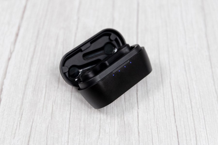 充电盒采用常规的翻盖式设计,外壳为磨砂质感的ABS塑料材质,表面不太容易沾染指纹和灰尘,中间有一条亮面的凹槽,起到装饰和辅助打开的作用。开口下方有四个蓝色指示灯,显示耳机当前的充电状态或电量情况。