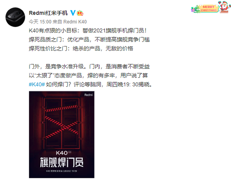 而在今天,Redmi官方在社交平台发布消息,称Redmi K40要做旗舰手机的焊门员。Redmi 手机官方说:“K40 有点狠的小目标:誓做 2021 旗舰手机焊门员!焊死品质之门;优化产品,不断提高旗舰竞争门槛。焊死性价比之门;绝杀的产品,无敌的价格。门外,是竞争水准升级。门内,是消费者不断受益。以 “太狠了”态度做产品,焊的有多牢,用户说了算。”