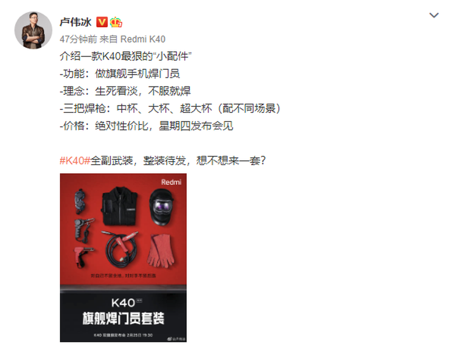 而在随后,小米集团副总裁,中国区总裁,红米Redmi品牌总经理卢伟冰在社交平台发布消息,消息中内容如下:介绍一款K40最狠的“小配件”