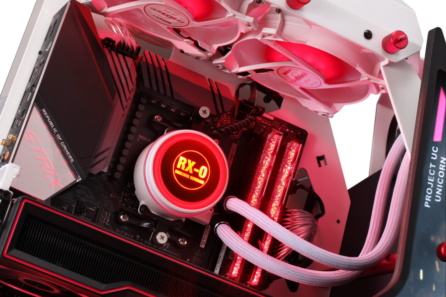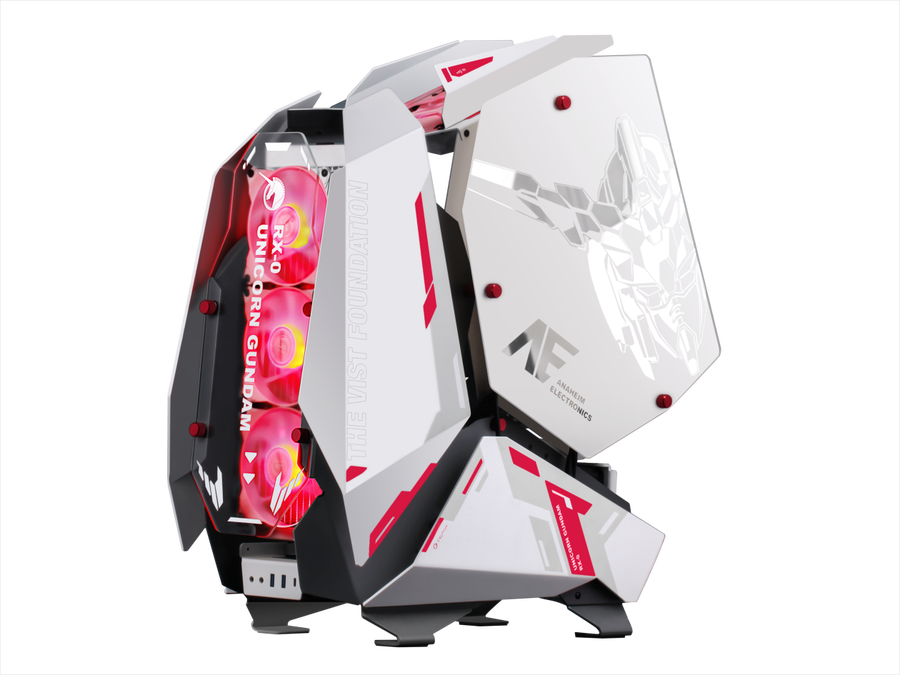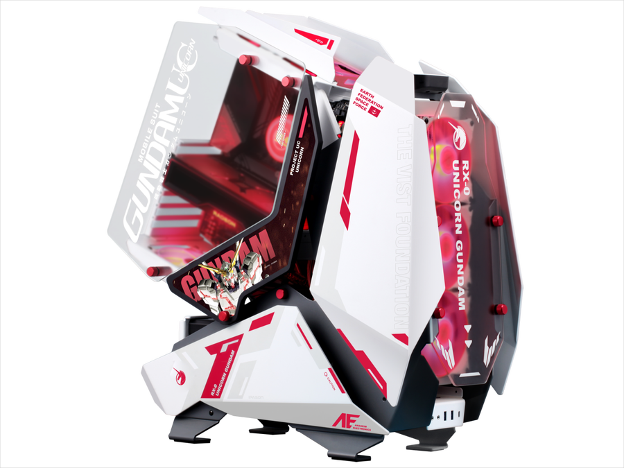 首先来说说外观,攀升高达独角兽典藏版游戏主机可谓相当的帅气。其采用了攀升精心设计的RX-0高达独角兽机箱,搭配RGB灯效,还有个性化的MOD贴纸可以装饰,颜值满分,摆放在自己的电脑桌上面,简直不要太帅!