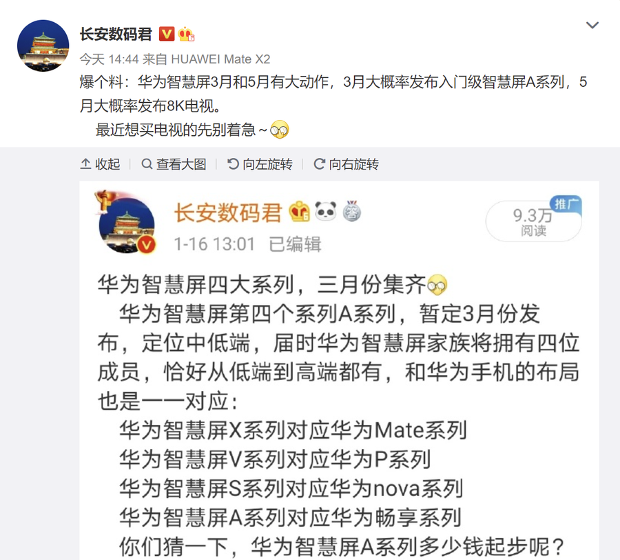 根据博主 @长安数码君 爆料,华为智慧屏3月和5月有大动作,3月大概率发布入门级智慧屏A系列,5月大概率发布8K电视。