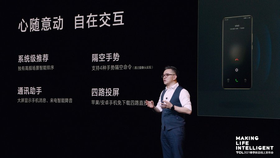 在投屏功能上,搭载UI5.0的C12智屏将上线“四路投屏”功能,该功能支持苹果和安卓手机免下载应用直投智屏,最多可使用4部手机进行镜像投屏,解锁聚会游戏新玩法。值得关注的是,TCL联合vivo首发上线通讯助手功能,智屏能同步提醒vivo手机来电与消息通知。当vivo用户使用手机接听电话时,智屏将自动降低当前音量,保持通话清晰。