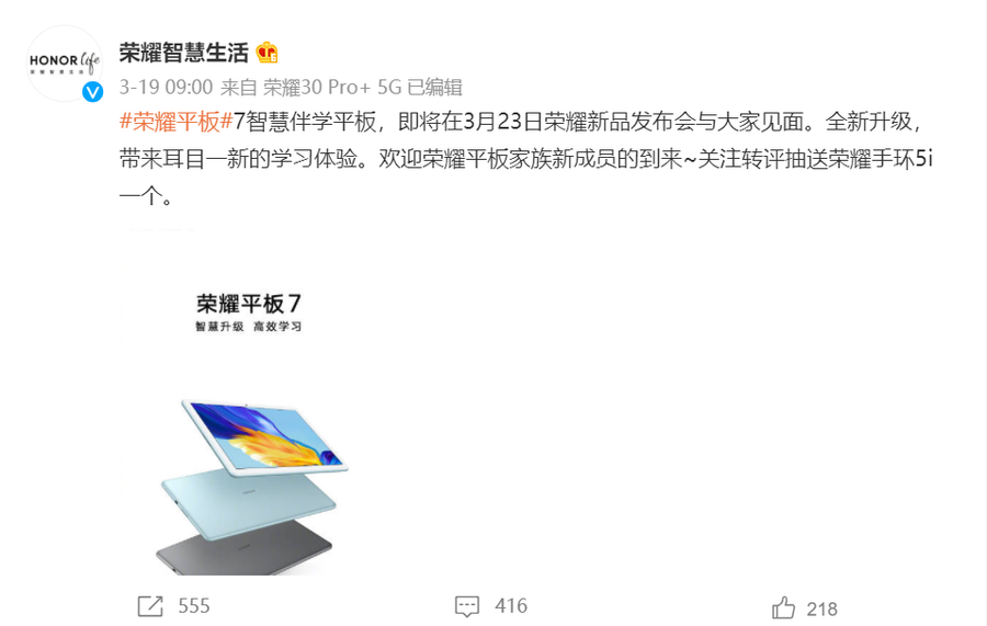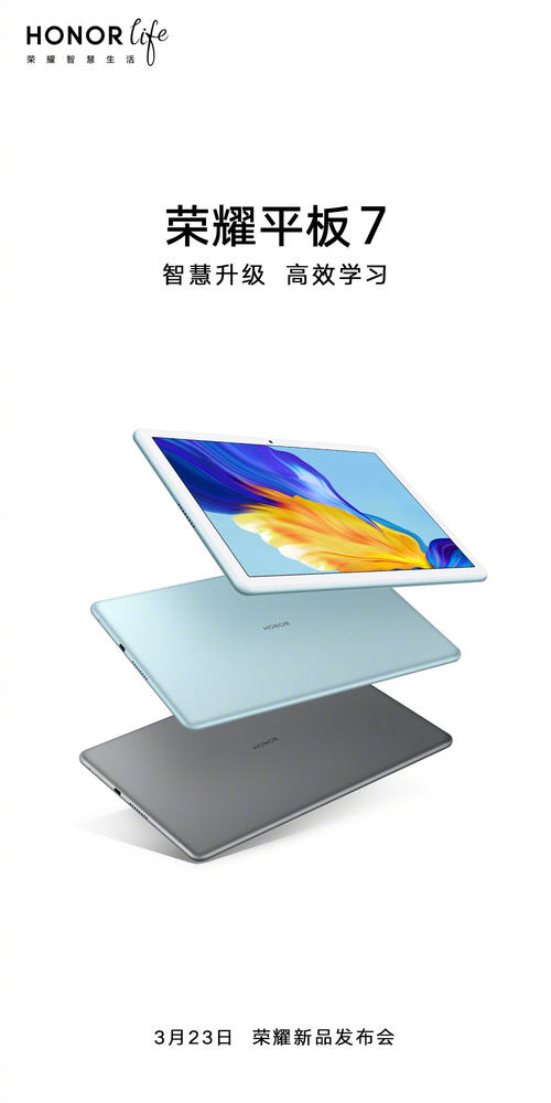 3月22日,荣耀智慧生活官微宣布,荣耀平板7将会在3月22日正式发布。