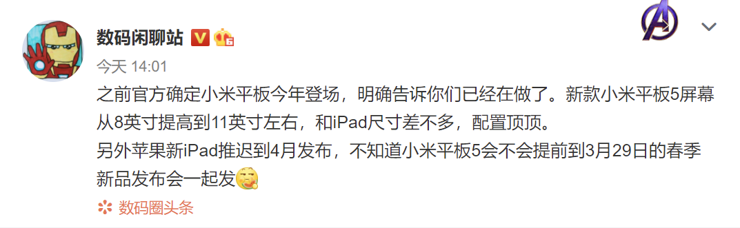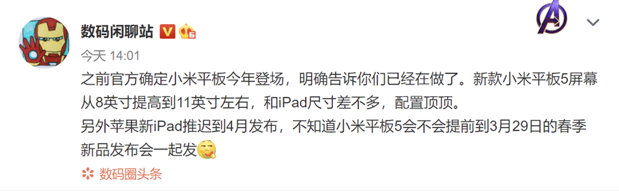 今日,@数码闲聊站 爆料称,今年初官方确定今年登场的小米平板5,屏幕尺寸将从8英寸提高到11英寸左右,和iPad 10.2寸差不多,并且有望在刚刚官宣的3月29日春季新品发布会上亮相,抢在新iPad之前。