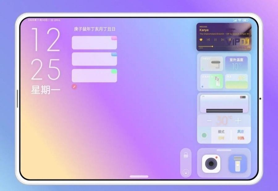 此前,小米平板5的正面渲染图已经曝光,它采用全面屏的设计,四周边框很窄,右侧是前置摄像头,系统风格也与旧版的MIUI有了很大改变。