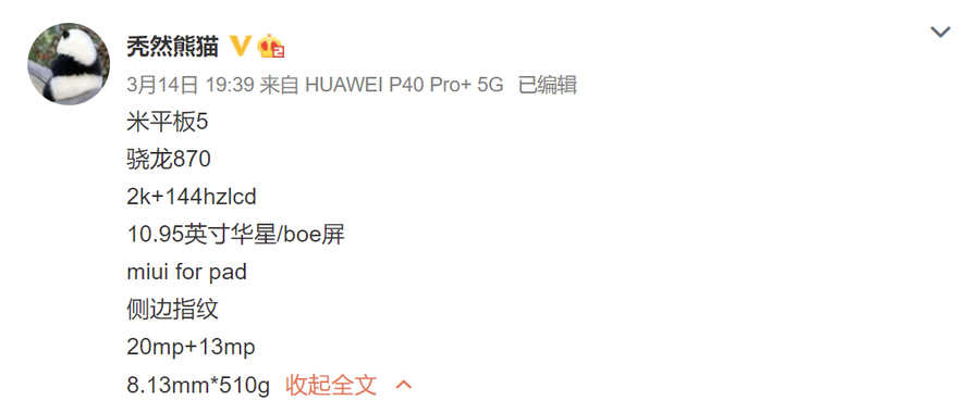 同时,博主 @秃然熊猫 还爆料,小米平板5将拥有天玑1200/骁龙870两个配置,配备一块10.95英寸的2K+144Hz LCD屏幕,搭载MIUI for Pad系统,无论是追求高性能还是性价比都非常值得期待。