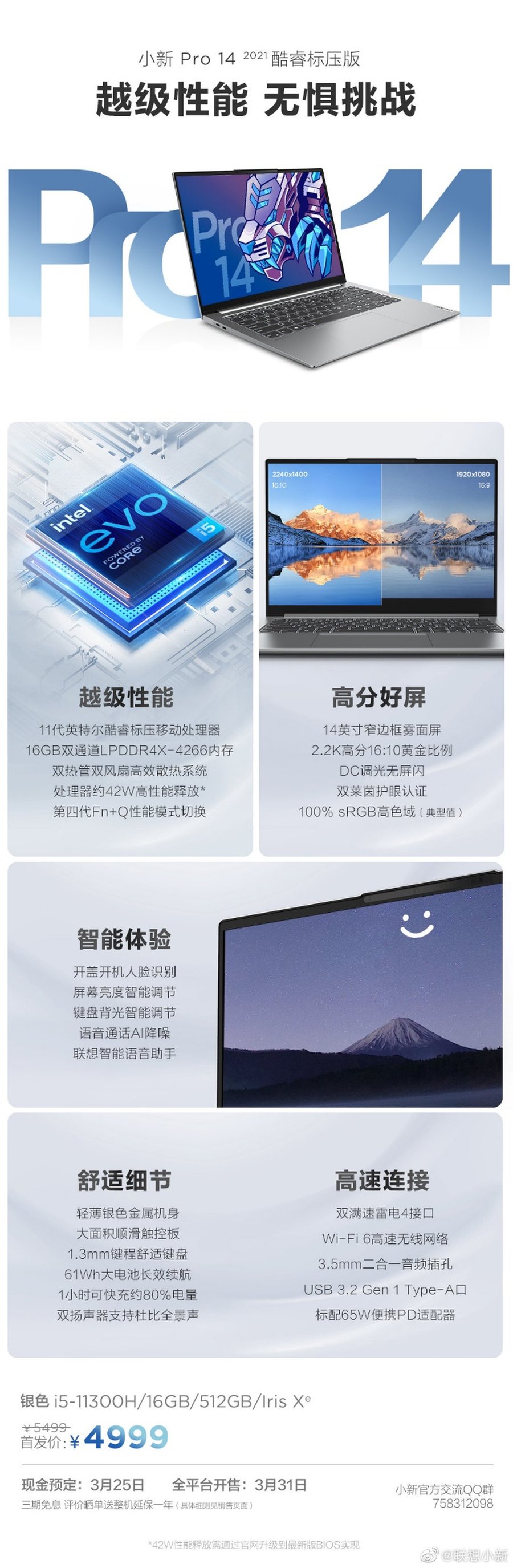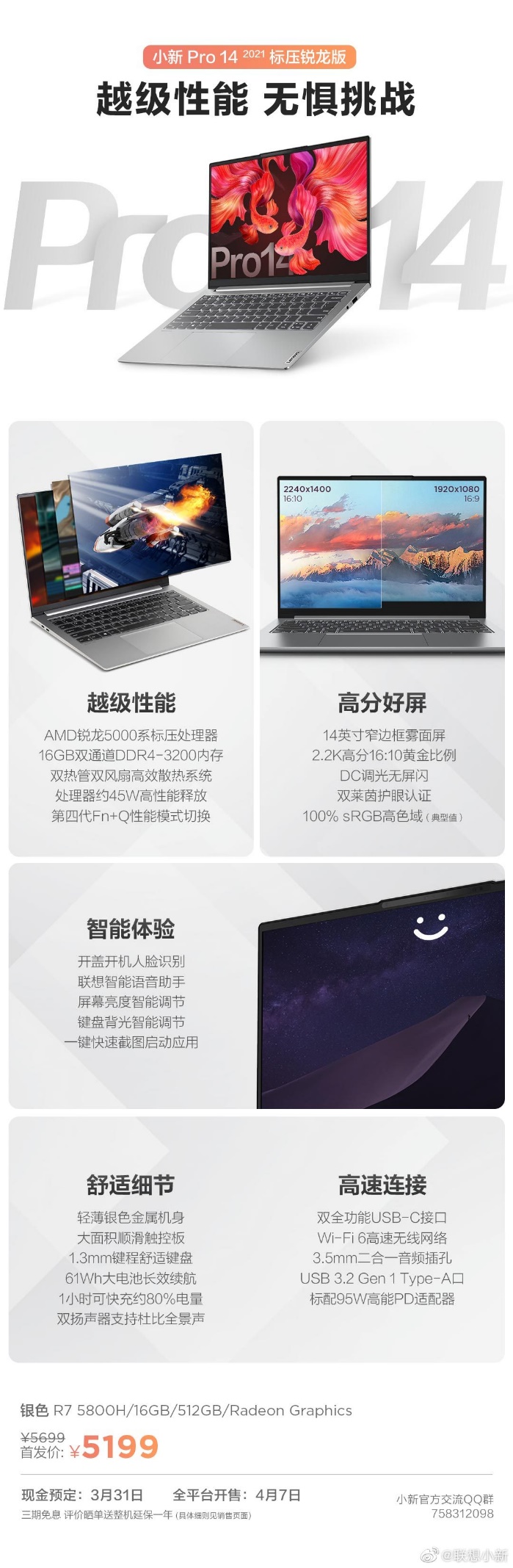 联想今日公布了联想小新 Pro 14 2021 的价格:标压锐龙版(R7 5800H)5199 元、酷睿标压版(i5-11300H)4999 元,3月31日开售。