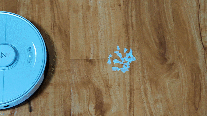 首先测试纸屑的清洁情况,将手纸剪成小块,放到地面上,手纸屑很轻,容易被风吹散。不过当石头扫拖机器人T7 Plus经过之后,能够将所有的纸屑全部清理干净。