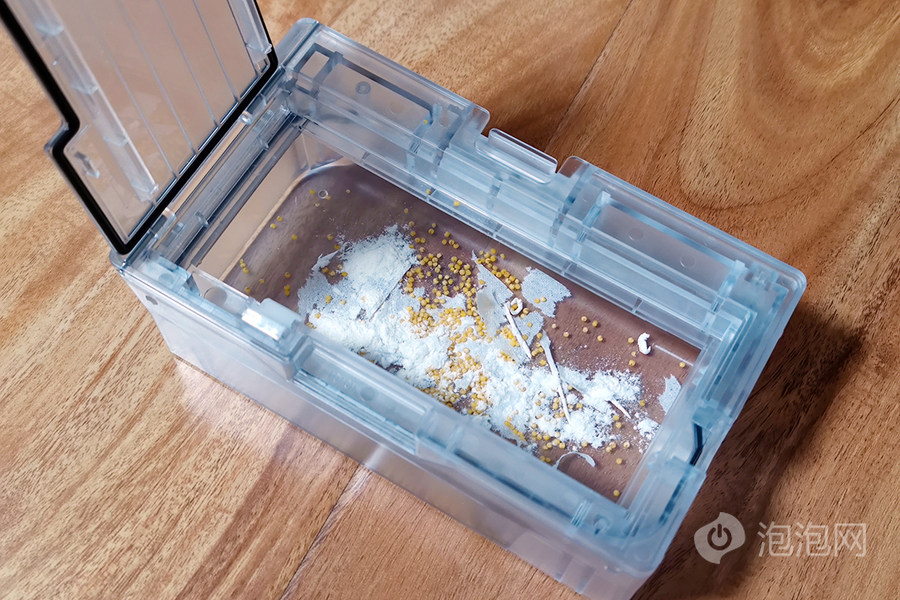我们在尘盒放入了一些纸屑、小米及面粉用来模拟尘盒中的清扫后的灰尘。