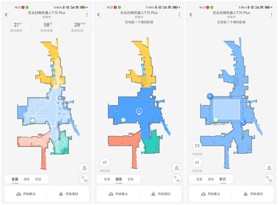 通过APP,可以查看到石头扫拖机器人T7 Plus清扫情况,也可以通过APP进行房间清扫顺序的调整,可以优先清扫卧室,再清扫客厅。还可以在地图上设定虚拟墙、清扫禁区和拖地禁区,自行管理清扫区域,定制化程度可以说是非常高了。