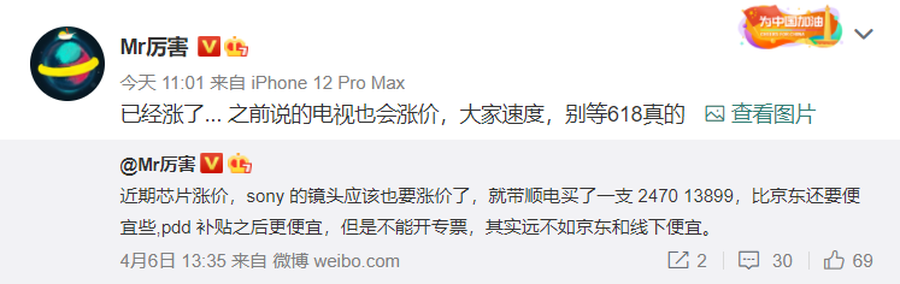 从他们的解释来看,涨价主要跟疫情影响全球原材料供应有关,尤其显示面板、芯片价格波动非常大。知名博主 @Mr厉害 也透露这样的情况短期内或许很难有改善,想购置新电视的朋友近期瞅准好价就可以入手了,618价格大概不会很美丽。