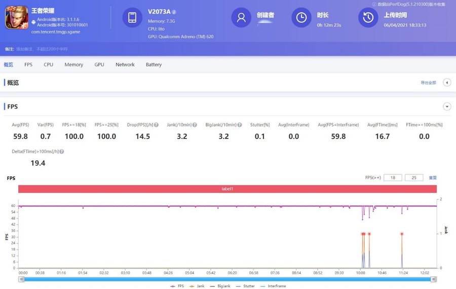 《王者荣耀》特效全开的画质设置下,平均帧率达到59.8帧,游戏帧率全程都十分稳定,画面流畅度很好。iQOO Z3的屏幕支持180Hz触控采样率,操作起来响应也很迅速。