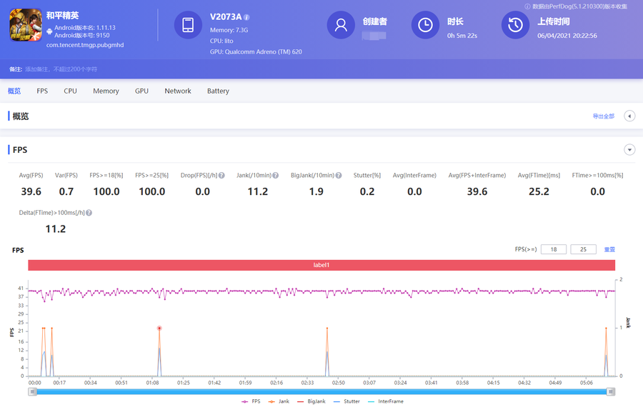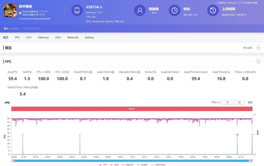 《和平精英》游戏在流畅画质下可以开启极限帧率,软件记录的游戏平均帧率为59.4帧,游戏整体帧数波动也不大,即使是开车或者对战场景,都能保证稳定的流畅度。