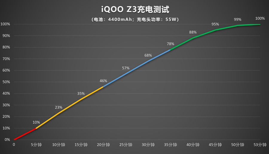 在电量耗尽自动关机后用原装充电器进行充电测试,iQOO Z3 15分钟就能达到35%的电量,30分钟达到68%的电量,达到100%的电量用时53分钟,能够缩短充电等待时间。