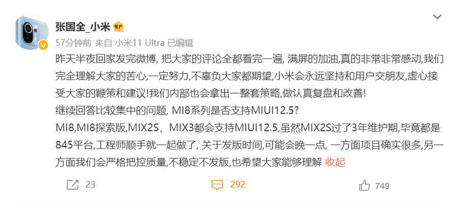 4月9日,据小米手机系统软件部总监张国全透露的信息,小米8和MIX 2S等老机型也会支持MIUI 12.5。