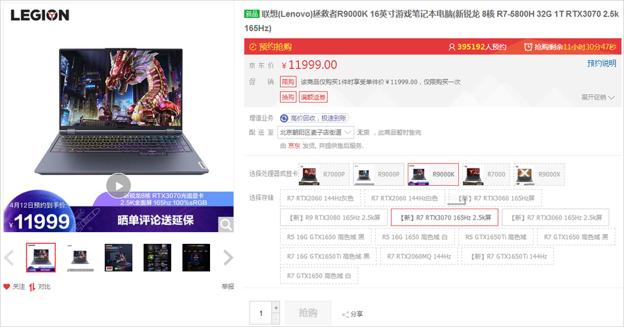 4月12号零点整,联想拯救者R9000K第二波抢购。由于人气太火,这批货直接秒没,大量消费者抱怨根本就抢不到。