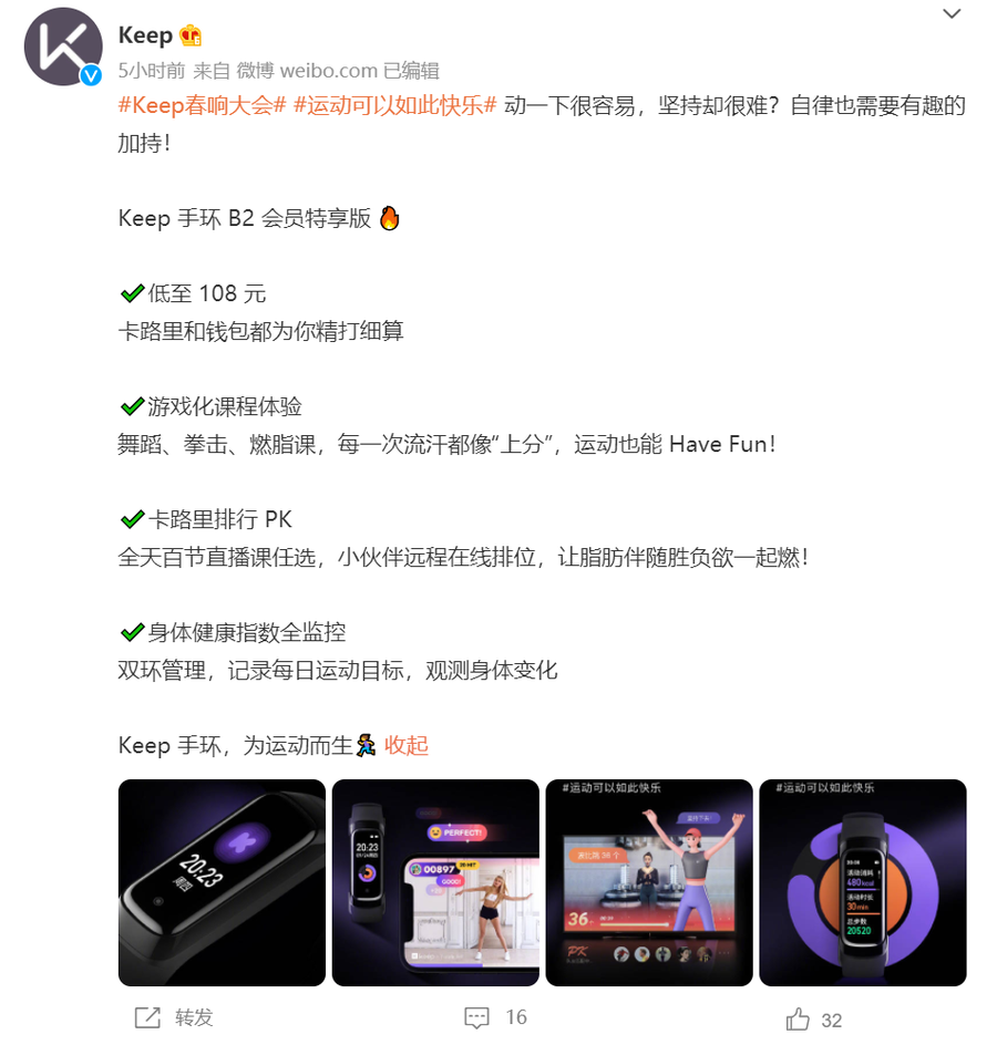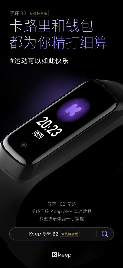 4月21日,Keep发布了Keep手环B2会员特享版,售价108元。