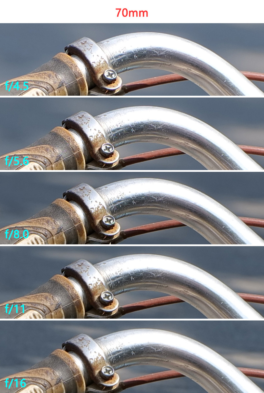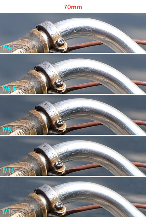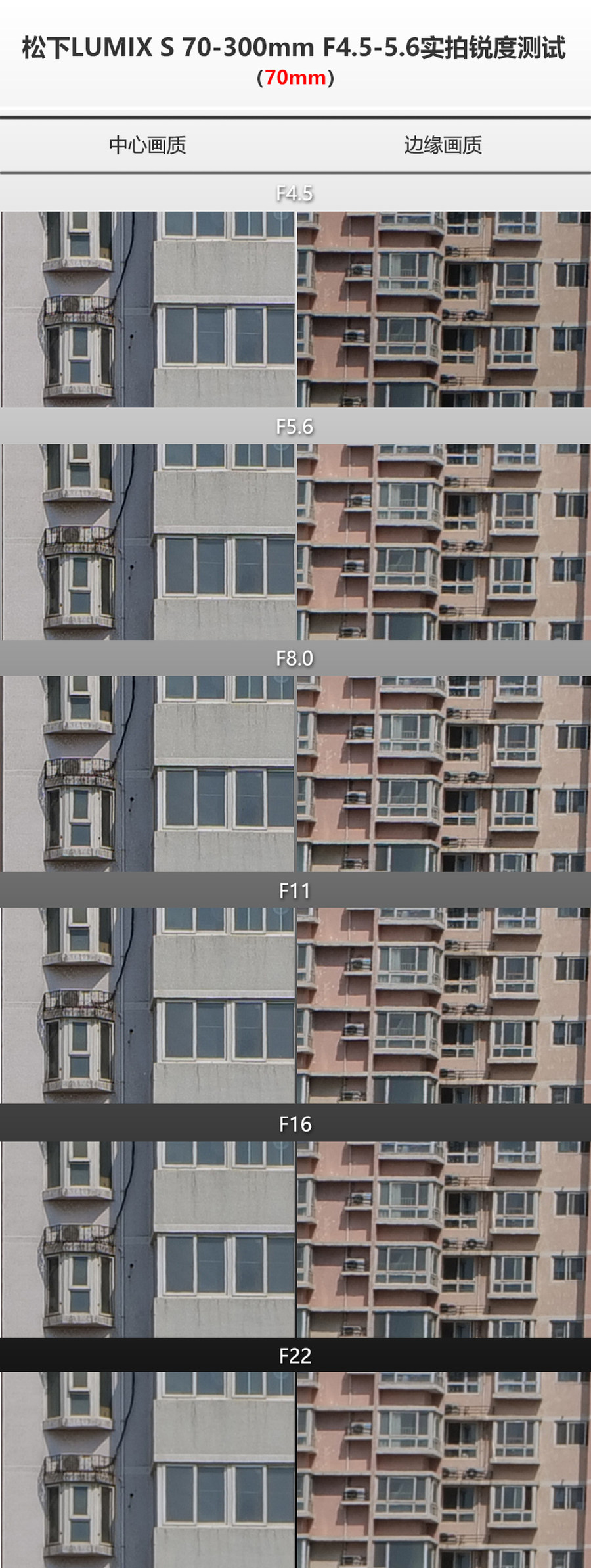 从上面的100%截图可以看出,这支LUMIX S 70-300mm F4.5-5.6 MACRO O.I.S镜头的UHR镜片确实发挥了不小的作用,在70mm端时,中心分辨率即便在F4.5最大光圈下,画面就有非常不错的锐度表现,并且边缘画质也十分扎实,没有表现出画面很肉的情况;随着光圈的缩小,画质再度上升,最佳光圈出现在F5.6-F11之间。而当光圈缩小到F16以后,中心画面锐度因为光线衍射的原因随之下降。但比较让人惊喜的是,相比于中心,LUMIX S 70-300mm F4.5-5.6 MACRO O.I.S的边缘画质一直都保持非常高的水准,一般来说,大变焦镜头中边缘画质都会有不同程度的衰减,但这次即便在F4.5-F16之间边缘画面的细节也得到很好还原,与中心画质并没有明显差距,即便是在F22这样非常小的光圈下也完全可用。