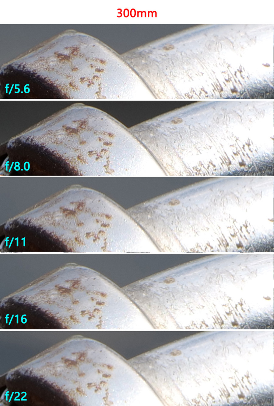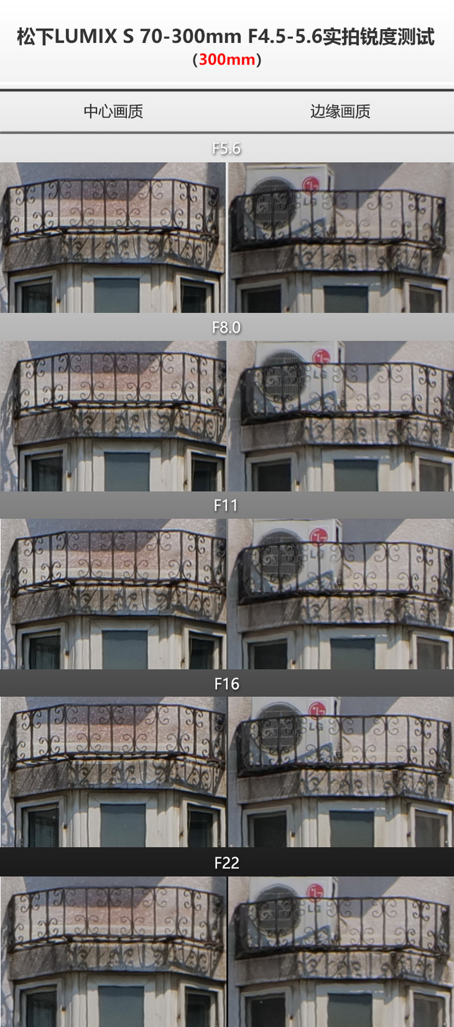 在300mm端,松下LUMIX S 70-300mm F4.5-5.6 MACRO O.I.S.中心分辨率的最佳表现为F5.6-F16,光圈全开可以放心使用。边缘区域在F5.6最大光圈时画面偏肉,当光圈收缩一档后情况要好很多;在F22光圈时受到镜头衍射现象的影响,画质解析力下降。总体来说,LUMIX S 70-300mm F4.5-5.6 MACRO O.I.S.的特点是各光圈下都具备锐利的表现,相信如果搭载更高像素的LUMIX S1R全画幅微单时应该会有更佳的表现。