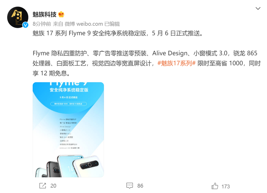 魅族17系列Flyme 9稳定版5月6日推送