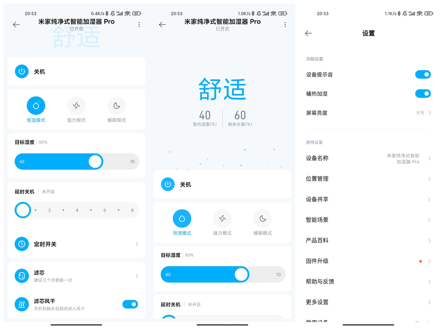 使用米家APP可以更查看当前环境的湿度情况,APP会根据数值给出舒适或者干燥等信息,让用户可以更直观的了解到目前环境的状态。在APP中还可以设置目标湿度,避免房间过于湿润。