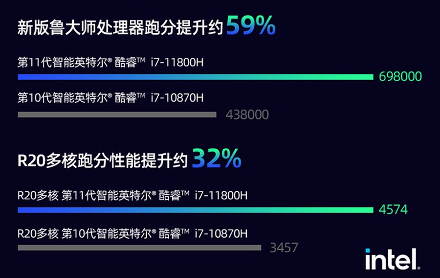 酷睿i7-11800H处理器的性能有多猛呢?以经典的跑分软件CineBench R20为例,酷睿i7-11800H的全核性能相比上代酷睿i7-10870H足足提升了约32%,确实很惊艳了!