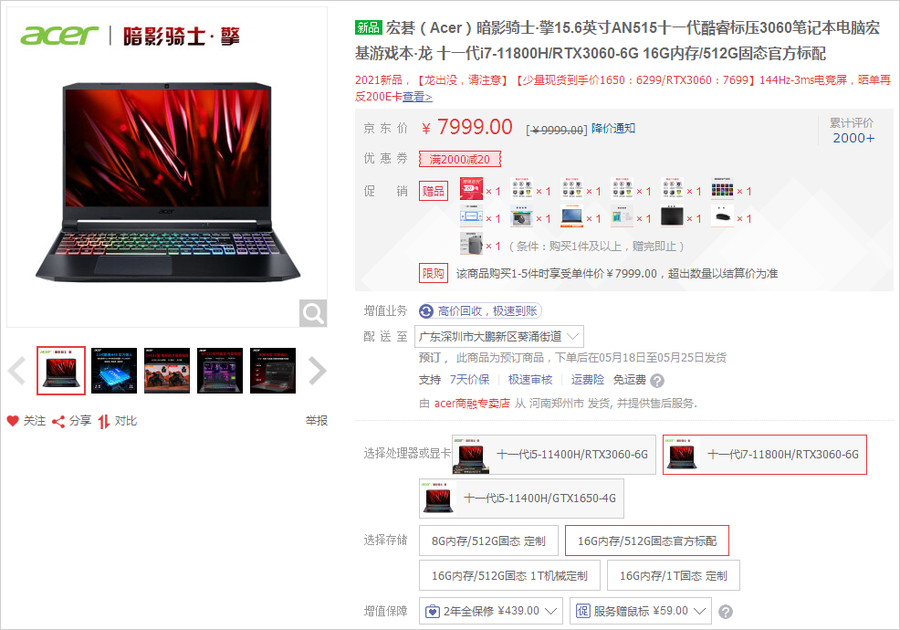 宏碁暗影骑士·擎同样是一款高性价比的游戏本。此次推荐的这款机型,酷睿i7-11800H八核处理器搭配RTX3060显卡的配置组合,售价不到8千块钱。