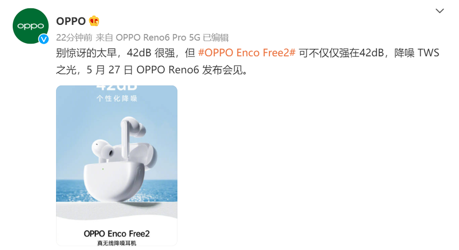 5月20日,OPPO宣布,OPPO Enco Free2真无线蓝牙耳机将在5月27日发布。