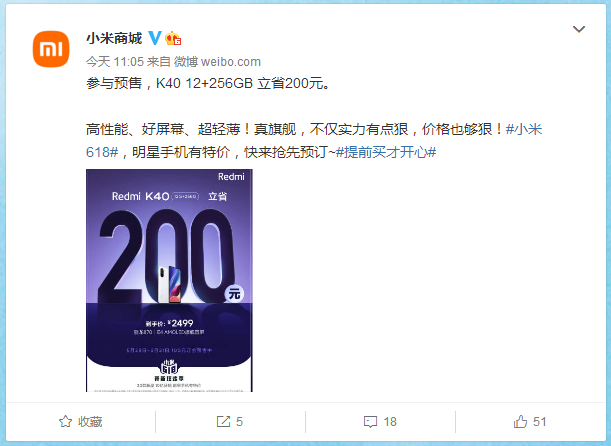 小米最新公布了Redmi K40 12+256GB手机618大促的活动信息,现在参与预购的消费者可立省200块钱,618开门红到手价仅2499。