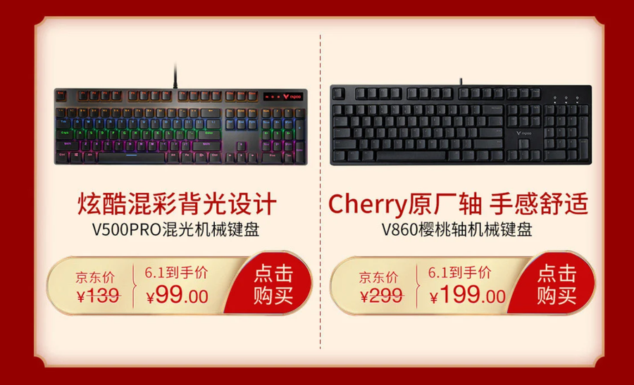 优惠幅度同样很大的还有雷柏V860 机械键盘,原价299元,活动到手价只需199元,相当于直降100元。雷柏V860 机械键盘采用原厂Cherry轴,让你可以体验原汁原味的原厂手感,还支持104键无冲突,打字或者玩游戏都获得畅快的体验。