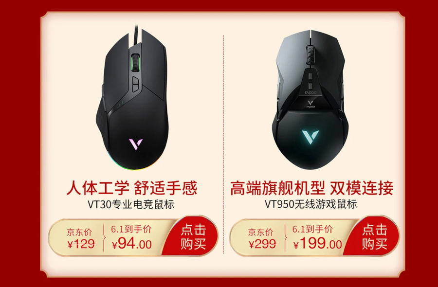 同样直降100元的还有雷柏VT950电竞游戏鼠标,原价299元,活动到手价199元。雷柏VT950电竞游戏鼠标支持无线/有线双连接模式,搭载PMW3389传感器、内置OLED显示屏,支持可拆卸配重块等,是电竞玩家的游戏利器。