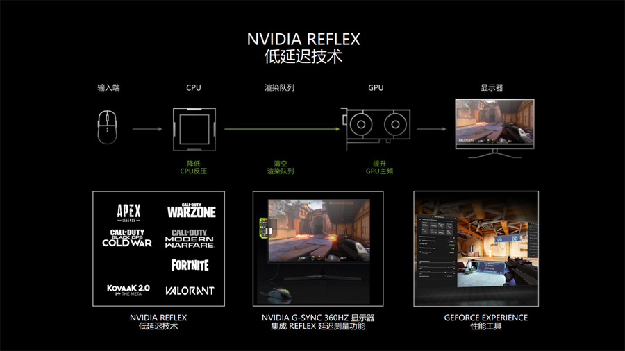 GeForce RTX 30系列显卡还支持NVIDIA Reflex低延迟技术,搭配NVIDIA G-SYNC显示器,可提供更低延迟和更出色的响应速度,帮助玩家更快地捕获目标,更迅速地作出反应并提高瞄准精度。