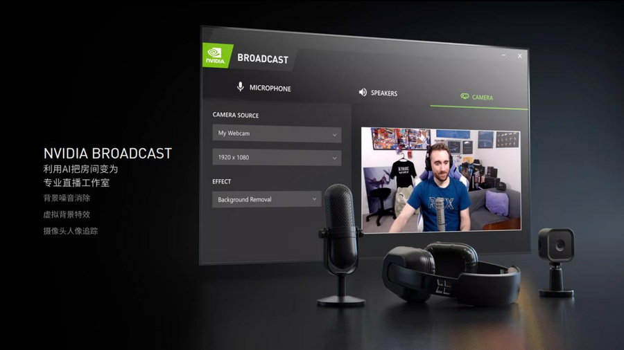 NVIDIA Broadcast利用 AI 的强大功能将普通摄像头和麦克风转变为智能设备,实现噪音消除、虚拟背景、人像跟踪,让用户可以轻松地将自己的房间升级为家庭直播工作室。