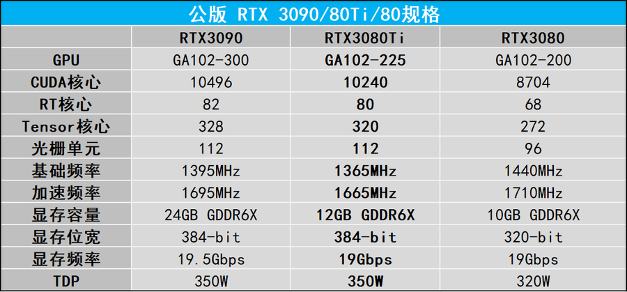从NVIDIA公布的规格来看,RTX 3080 Ti采用了GA102-225核心,无论CUDA核心及频率,还是光追、Tensor单元的数量,甚至显存的带宽,都与RTX 3090极为接近,二者最大的区别还是在于RTX 3080 Ti相比RTX 3090在显存容量上减半至12G。