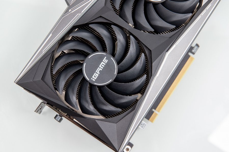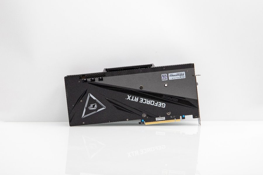 背板印有白色GEFORCE RTX字样和iGame标志,突出Vulcan的“三角形”视觉符号的同时还支持RGB效果。背板为纯金属,表面做了细腻的磨砂处理,采用黑色与深灰色撞色设计,显得质感十足。