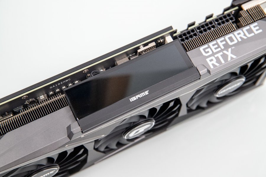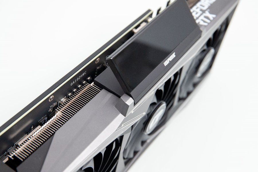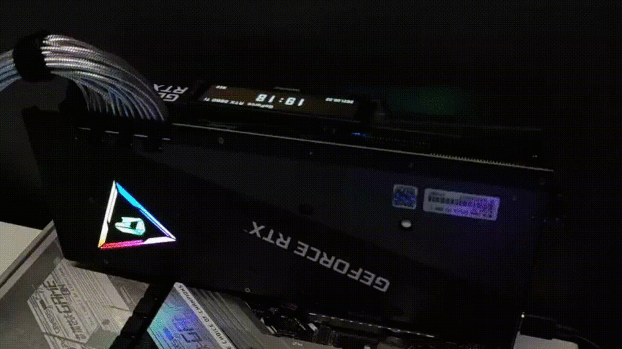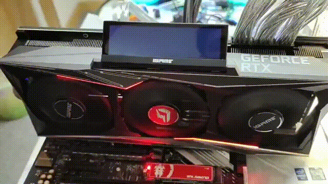 显卡顶部最为显眼的是火神系列标志性的小屏幕,这块屏幕为LCD面板,分辨率为480X128,与前代不同的是,这款屏幕本身改为了翻转屏设计,可以实现90°的角度翻转,这样一个设计使得显卡不论在机箱内以何种角度安装,都能让显示屏可以朝向方便观看的角度。