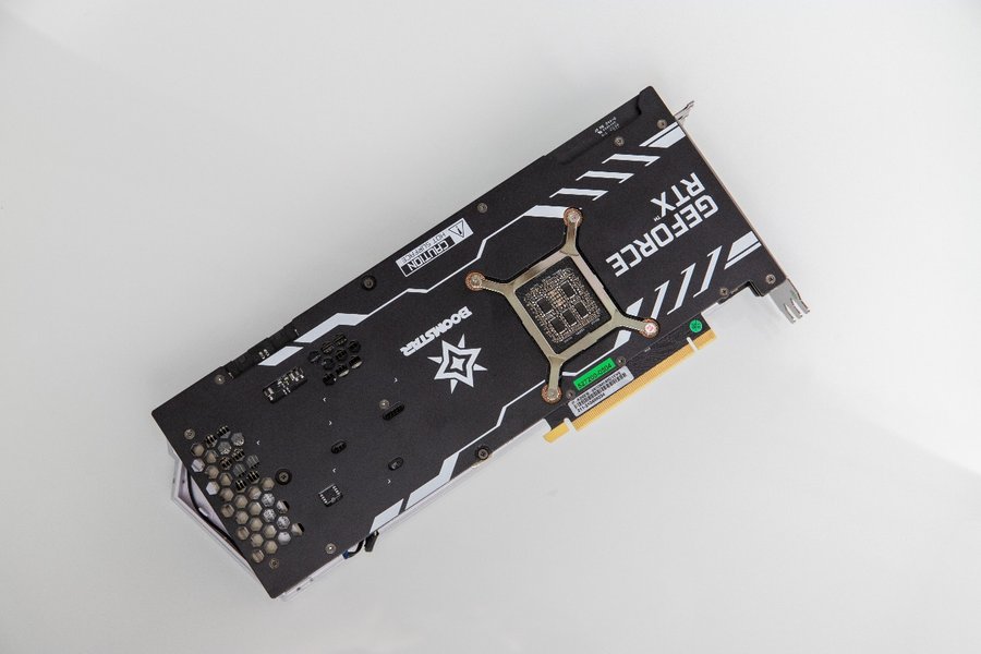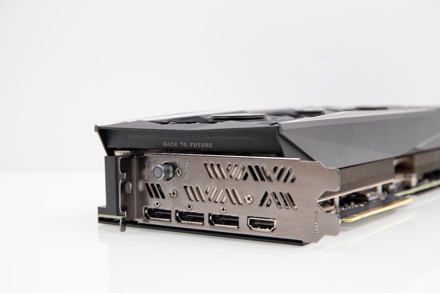 显卡挡板部分做了镂空设计,显示输出接口为三个DP 1.4a和一个HDMI 2.1,最上方的小按钮是一键超频按钮,按下后会亮起蓝色的指示灯。